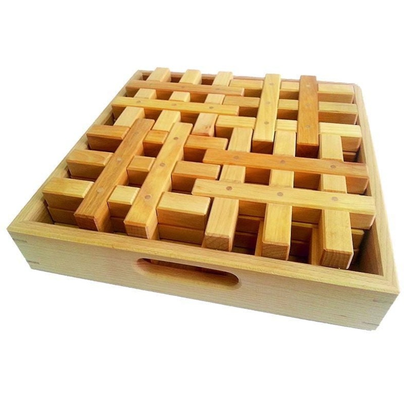 The longitudinal and transverse parts of the Grid Blocks are glued into each other and contain six pegs for robust stability. The blocks can be interlocked in countless variations to create houses, castles and palaces. The stable wooden box is provided wit