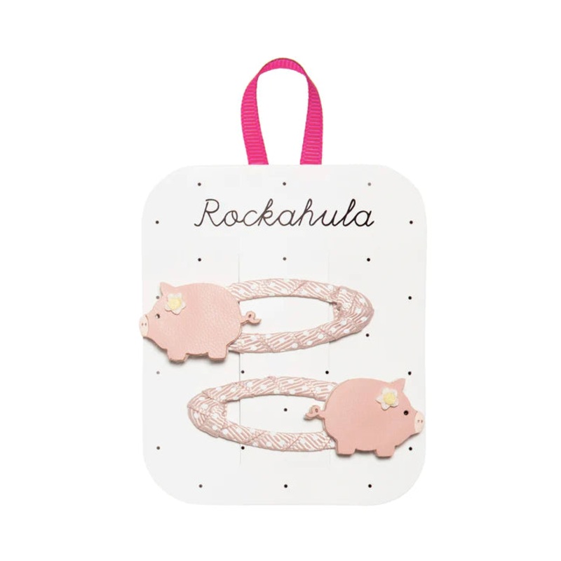 The sweetest little piggiesadorn these cute clips. Each pigis delicately detailed with a little flower and a cute curly tail, and is set upon a spotty pink grosgrain ribbon wrapped snap clip.Perfect for any springtime farm adventures!