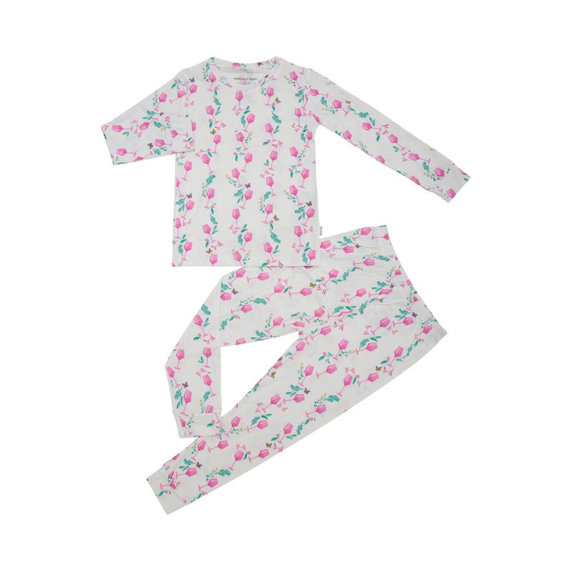 Upgrade Your Toddler's Sleepwear With A Super Soft Bamboo Two-Piece Set! Inspired By The Iconic Wlffer Estate Vineyard In Sagaponack. Clean White Background With Pink Ros Wine Glasses And Green Vineyard Vines. This Print Is Summer In A Bottle. The Softest,