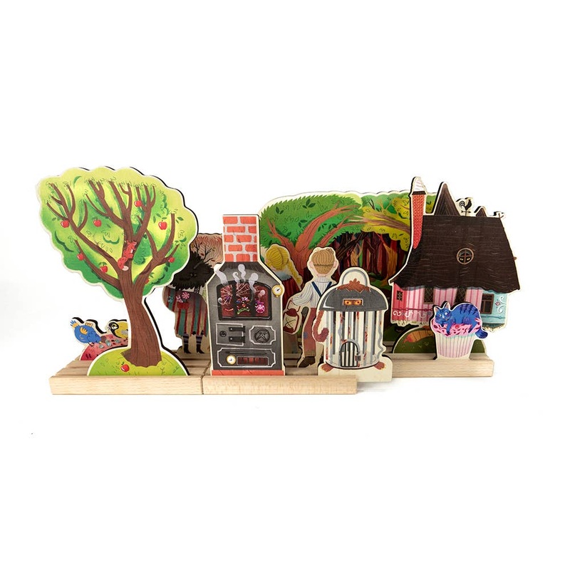 One side is a regular forest and on the other side is a world of candy. Do you remember this classic fairy tale? You can use the characters and elements of the scene to make your own story. Will the witch get away with her plans?