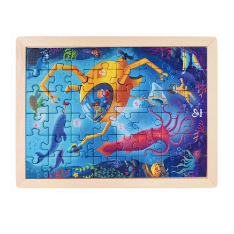 Dive deep into uncharted waters with this 48 piece jigsaw puzzle. The underwater scene features a deep-sea cleaning crew in a robotic submarine, a narwhal, a giant squid and lots of little squid. On the back there is an unpainted template that you can use