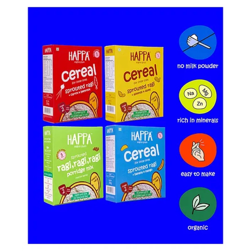 • Gluten free and vegan foodIngredientsRagi, Organic fruits and dryfruitsSpecificationsBrand – HappaType – PorridgeAge – 6 to 18 MonthsQuantity – 200 gm eachProduct descriptionHappa mighty grain Ragi porridge mixes are made up of 100% Organic sprouted Ragi flour. Sourced from exclusive organic certified farms, our non GMO Ragi porridge for babies is a great early food for your little moppet.Items Included in package4 boxes of porridge