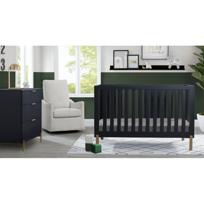 The Hendrix Nursery Set by Delta Children is the clear choice for your babys modern and affordable style nursery! Its unique design features a crib, dresser, glider, mattress, mattress pad, and sheets.