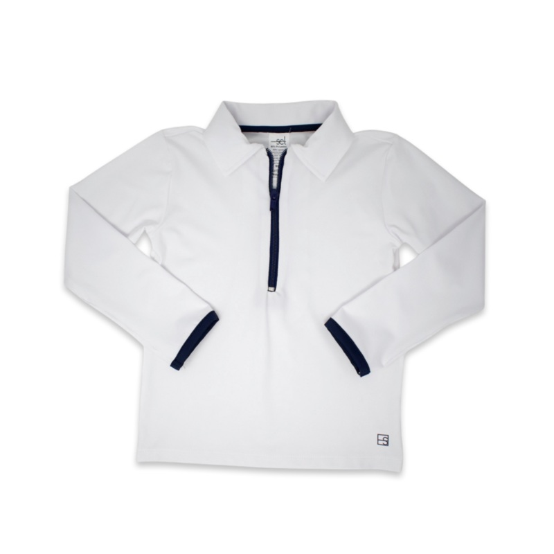 TheHenry Half Zip inPure Coconutand Nantucket Navy zipper is the perfect layering piece cooler days!From sports to comfy days at home, it’ll be hisfavorite to grab and go!