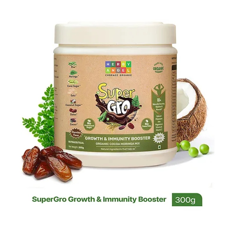Doctor recommended Milk Mix for everyday nutrition got 2 years old & above. Made with certified organic ingredients to supercharge your kids. Powerful combination of Moringa and Pea Protein to foster better growth in children. Zero- Preservatives, emulsifiers, synthetic flavors, artificial sweeteners, anti caking agents, milk solids, salt, additives. Made with natural and organic ingredients because our little super heroes deserve no lessItems Included in the Package 1 Qty Herby Angel SuperGro Milk Mix for Growth – 300 g