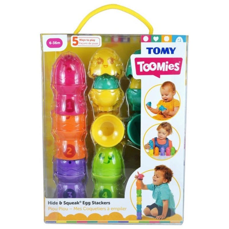 Contents: 6x TOMY Toomies Hide & Squeak Eggs & egg cupsOpen the eggs to reveal a cute chickPress the chicks to hear them cheep!Easy to grasp, stack and fit togetherTurn them over to discover different shapesMatch shapes and coloursIntroduce numbers one to