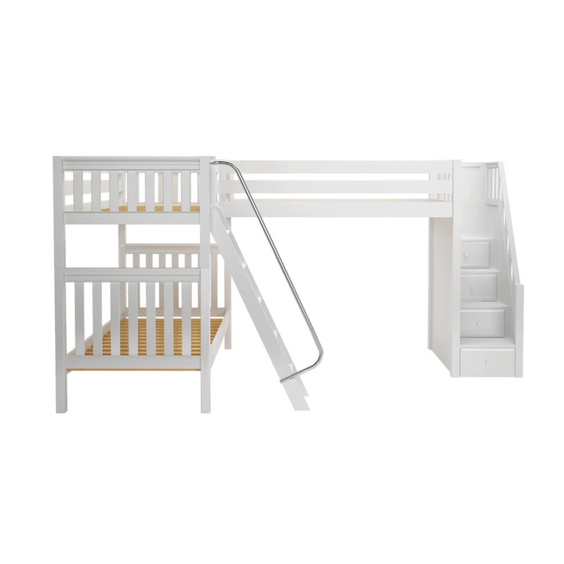 Maxtrix High Corner Triple Loft Bunk with Stairs and Angled Ladder BunksSleep, store, and play more with theMaxtrix High Corner Triple Loft Bunk with Stairs and Angled Ladder Bunks. Available in two versatile configurationsTwin XL over Twin XL Bunk + Twin