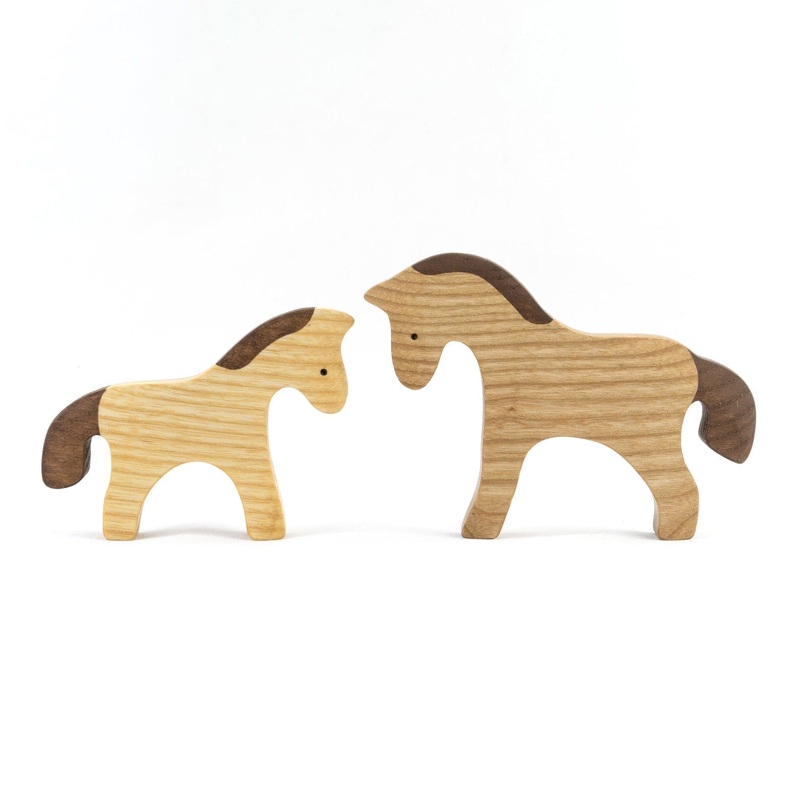 Set includes a horse and foal. These animals are made from 2/3 (18 mm) solid ash and colored with water-based paint that makes the paint semi-transparent to keep wood texture visible. Perfect for small world play, in the sandbox or sensory table, or as room decor. Colors and textures may vary slightly from photos since each product is made by hand.