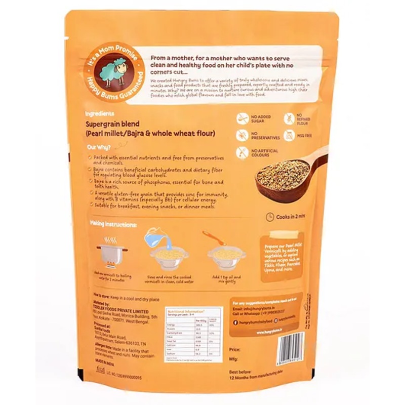 SpecificationsBrand Hungry BumsType – Millet VermicelliAge – 8 Months +Quantity – Pack Of 3 – 150gm EachProduct DescriptionPearl Millet Vermicelli is packed with essential nutrients and free frompreservatives and chemicals. Pearl Millet (Bajra) contains beneficialcarbohydrates and dietary fibre for regulating blood glucose levels. Bajra is arich source of phosphorus, essential for bone and teeth health. A versatilegluten-free grain that provides zinc for immunity, along with B vitamins(especially B6) for cellular energy. Suitable for breakfast, evening snacks, ordinner meals.