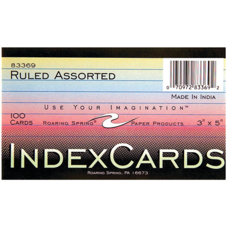 Find a million uses for these handy index cards. Produced with smooth 100# index paper in assorted colors, the cards are lined on one side with horizontal blue lines and a top red header line. The cards are 3" x 5", and there are 100 assorted color cards p