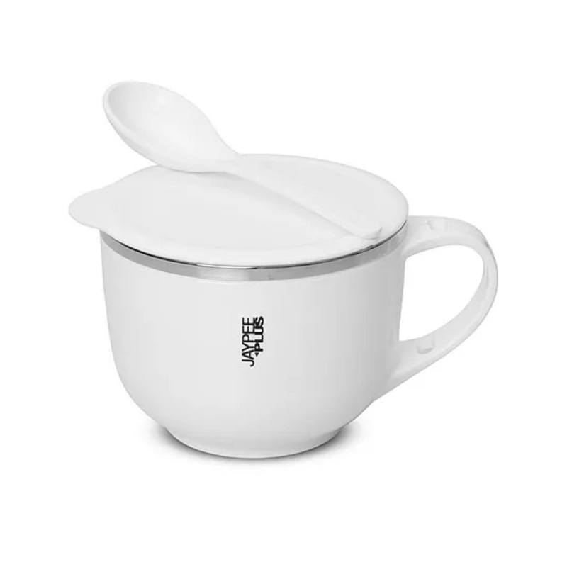 Jaypee Plus Stainless Steel Soup Bowl with Lid & Spoon Holder Souptok Maggi bowl Noodles pasta bowl Mug for kids – White