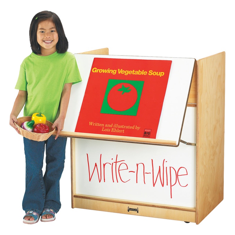 Mobile storage for big books, puppets and more. Write-n-Wipe folding easel to display big books. Caster mounted. 88 lbs. 36″ High x 30″ Wide x 27″ Deep. Lifetime warranty.