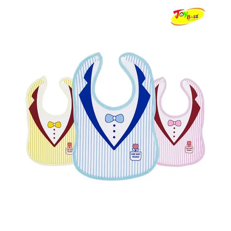 Waterproof Bibs with Snap ButtonQuick absorbing Round neck Tie Print BibEasy to WashGood quality Terry cottonGenerously sized and cotton is very softAttractive Colours and Cute designsSpecificationBrand – Joy BuzzType – BibsAge – 0 to 3 YearsProduct Dimensions – L 19 x B 28 cmNumber of Pieces – 3DescriptionWe have to stop their clothing from getting forever ruined by formula, pureed peaches, mushy peas, bananas and baby drool, all day. If you don’t want to let babies’ adorable faces blind you from chaos they will cause while eating, try our bibs right now. Our baby bibs are printed in full colour with baby-safe ink to ensure a vibrant bib that’s bound to stand out.Items included in the package3 Bibs