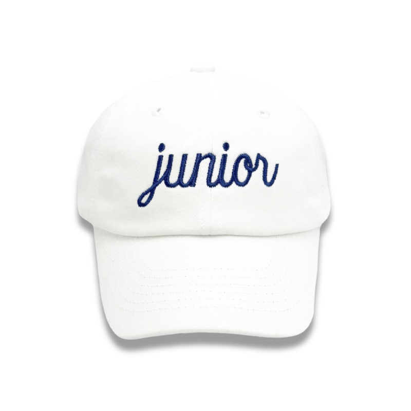 White baseball hat with "junior" embroidery. Soft-structured 6-panel design. Tuck strap with metal slide closure. 100% Cotton material. Baby-sized cap fits most children from ages 6-24 months old. Youth-sized cap fits most children from ages 2-7 years old.