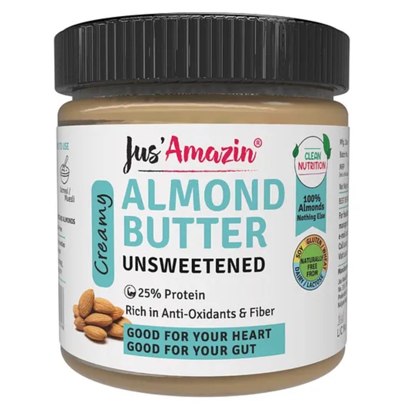 • No artificial preservatives, no refined sugar, no hydrogenated fatSpecification Brand – Jus’Amazin Type – Almond Butter Age – 2 Years + Made of – Glass Dimension – 7 x 7 x 82 cm Product Dimension after packing – 10 x 10 x 10 cm Weight after packing – 200 gms Items included in the package 1 Jar of Nut ButterThis delicious & nutritious protein packed almond spread \ butter (with 25% protein), is made from premium almonds and is ideal for those on a high-protein diet. Loaded with essential micronutrients (Vit B2, Calcium, Iron), it is high in dietary fibre and is diabetes friendly (low in carbs and has no sweeteners). Best enjoyed on toast, in a smoothie or mixed in with a bowl of oatmeal. Made without any hydrogenated fats, artificial preservatives and chemicals, this healthy butter has zero cholesterol and is dairy free, soy free, peanut free, gluten free and is suitable for vegans. Storage information Store in cool dry place from sunlight and heat Refrigerate on opening Consume within 60 days of opening Oil separation is a natural process, stir before consumption Ingredients Almonds (100%)