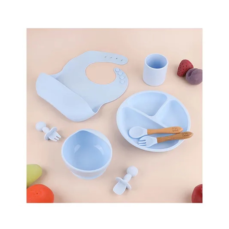 Value for Money- Combo of a plate, bowl, bib, wooden cutlery set, silicone cutlery set & mugFlexible & SoftGrips firmly onto a surface avoiding easy spillageEasy to clean BPA Free, Non-toxic,Food-Grade SiliconeSpecifications Brand - Kicks and CrawlType - S