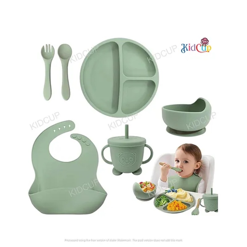 OCAL33215260883Kidcup 6 Pcs Silicone Baby Feeding Set, BPA Free & Microwave Safe Dinner Tableware Kit - Feeding Bowl, Suction Plate, Cup, Spoon, Fork & Bib for Kids (green) (Color & design may vary)