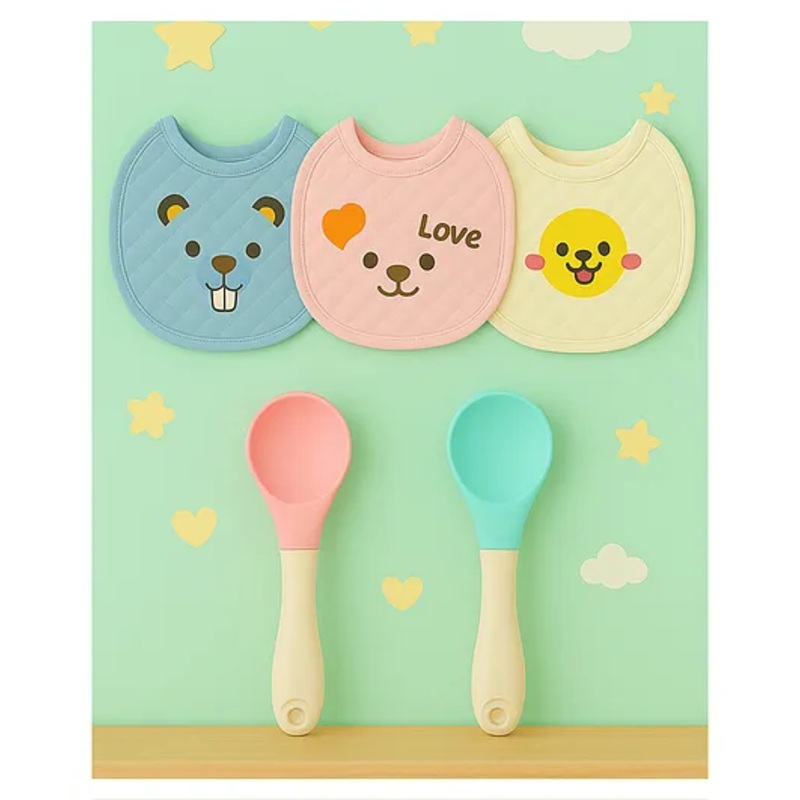 Complete Feeding & Protection Set This pack combines two essential silicone feeding spoons with three absorbent bibs, offering a comprehensive solution for introducing solids and managing mealtime messes.Soft & Safe Silicone Spoons The spoons feature soft,