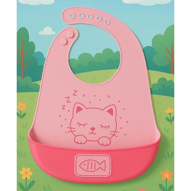 KIDS BASIC Soft Silicone Baby Bib with Food Pocket , Waterproof & Adjustable , Cute Kitty Design – Dark Pink (Pack of 1)