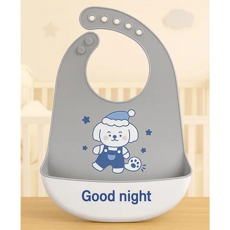KIDS BASIC Soft Silicone Baby Bib with Food Pocket , Waterproof & Adjustable , Good Night Bear Design – Grey White (Pack of 1)