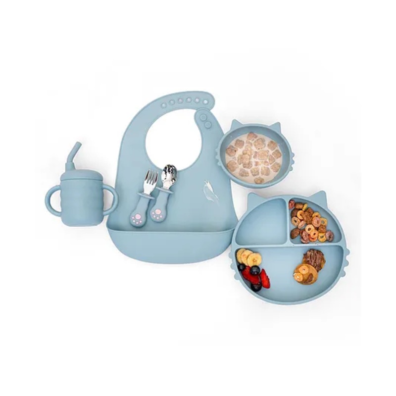 Kids Station 6-Piece Silicone Baby Feeding Set Cat-Shaped Plate, Bowl, Bib, Sipper, Spoon & Fork Easy Carry & Unbreakable Promotes Self-Feeding Eco-Friendly & BPA-Free Blue