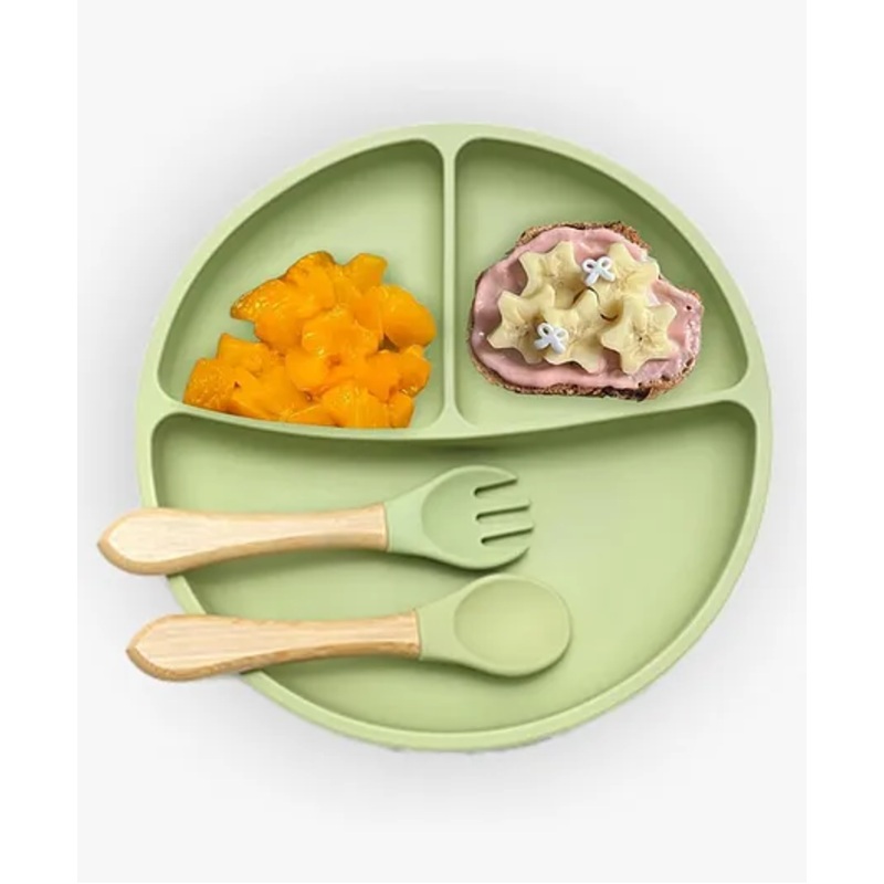3-in-1 Feeding Set Plate, Spoon & ForkMade of 100% Food-Grade Silicone, BPA-Free & Non-ToxicStrong suction base prevents spills & messesMicrowave, Dishwasher, Oven & Freezer SafeSoft edges encourage safe self-feedingLightweight, durable & easy to cleanFres