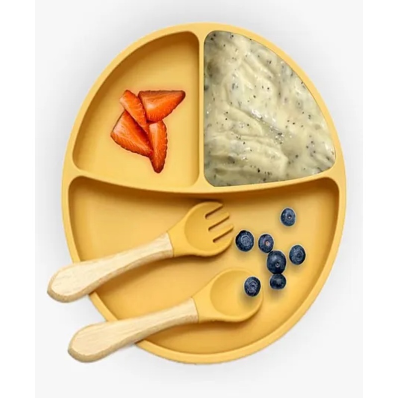 3-in-1 Feeding Set Plate, Spoon & ForkMade of 100% Food-Grade Silicone, BPA-Free & Non-ToxicStrong suction base prevents spills & messesMicrowave, Dishwasher, Oven & Freezer SafeSoft edges encourage safe self-feedingLightweight, durable & easy to cleanBright yellow design makes mealtime fun & engaging