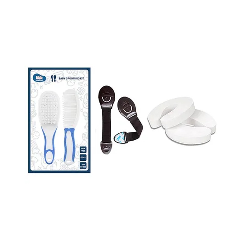Product DescriptionThe Kids Station Baby Safety & Grooming Combo Pack is a must-have for child and pet safety. It includes baby-proofing finger pinch door guards, safety locks, and a grooming kit, ensuring protection and hygiene for your little one. Made from high-quality, non-toxic materials, the set helps prevent door accidents and keeps your baby clean and well-groomed. Perfect for home use and travel, this combo pack is a great addition to any nursery!Items Included in the Package2 door guards, 2 safety locks, pack of 2 grooming kit