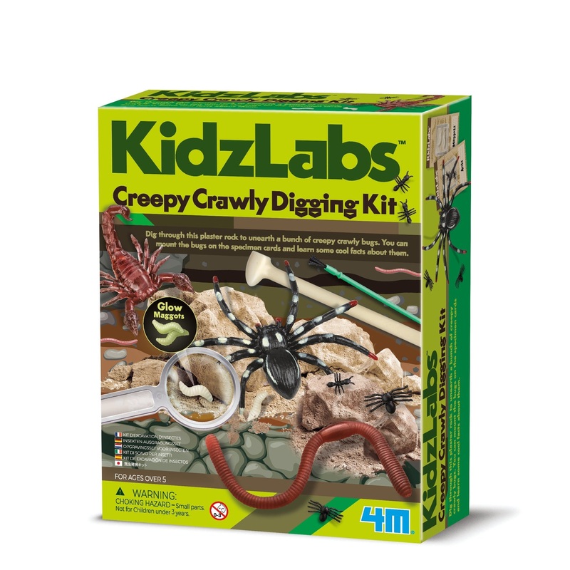 The KidzLabs Creepy Crawly Digging Kit is the perfect way to unearth interesting bugs and more!Dig through this plaster rock to unearth a bunch of creepy crawly bugs. You can mount the bugs on the specimen cards and learn some cool facts about them.The set