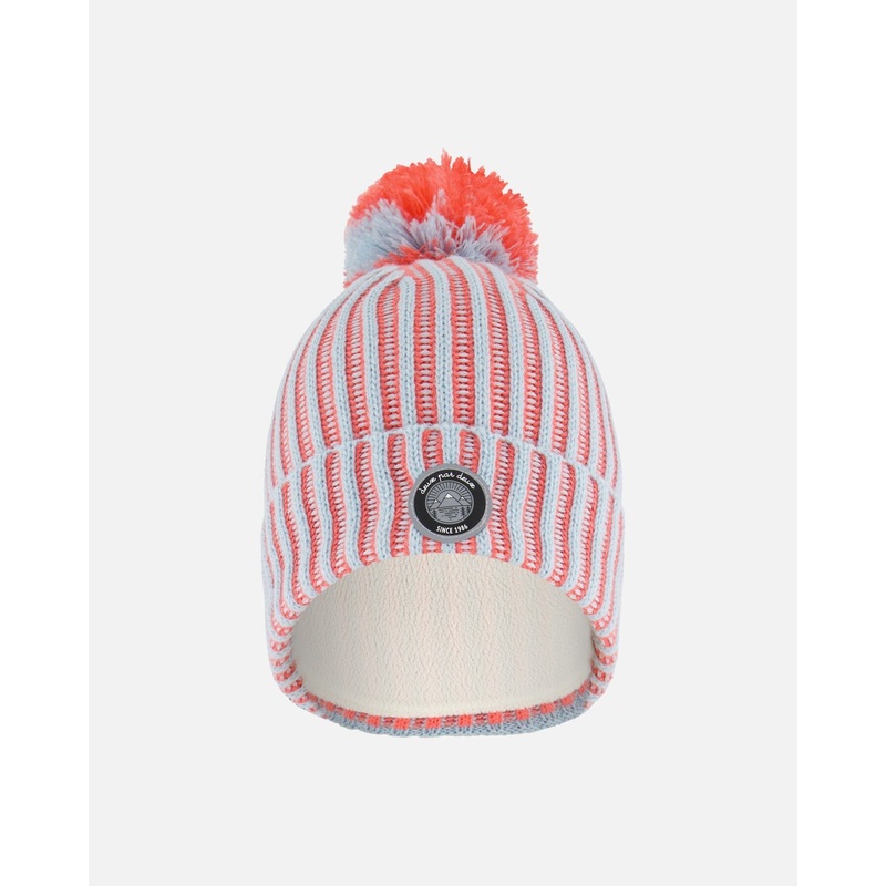 Fulfilled by our friends at Deux par DeuxStay warm on the coldest days with our Knit Hat Air Blue and Coral! This rib stitched beanie hat is made from super soft acrylic yarn and features a cozy lining, a cuffed hem, and a fun two-tone pompom on top. A log