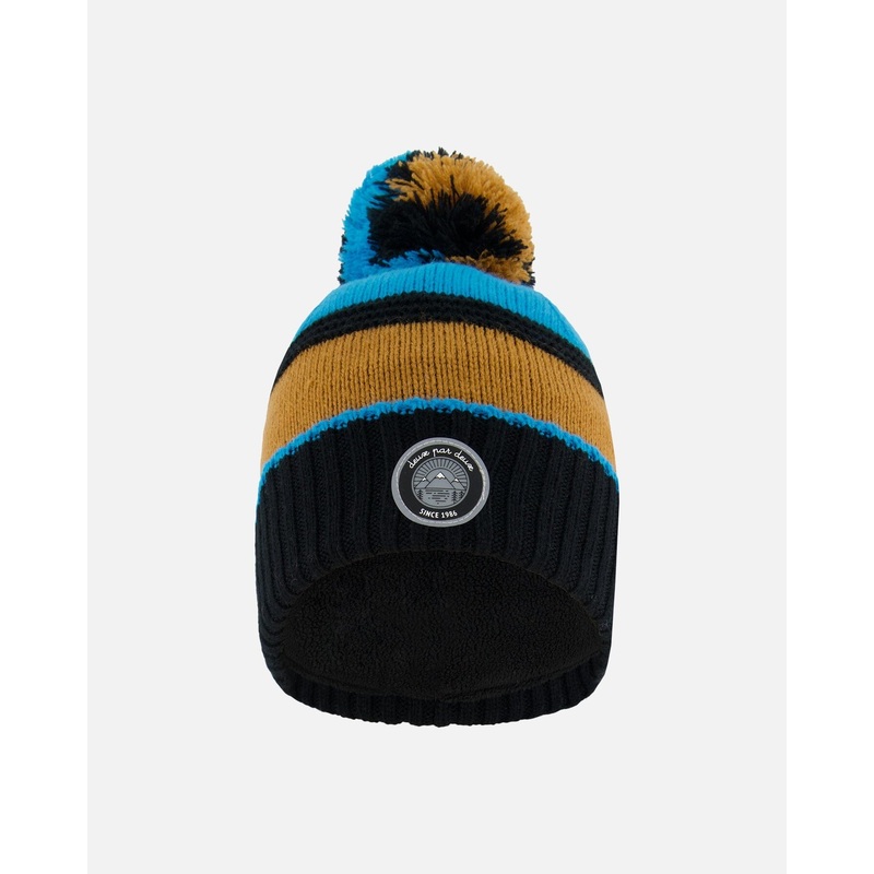 Fulfilled by our friends at Deux par DeuxOur Knit Hat Blue, Black and Spice is a must-have on cold weather days. Oh-so-soft in acrylic yarn, this beanie hat features an easy pull-on fit with a cozy lining, a fluffy pompom on top, and a horizontal stripe pa