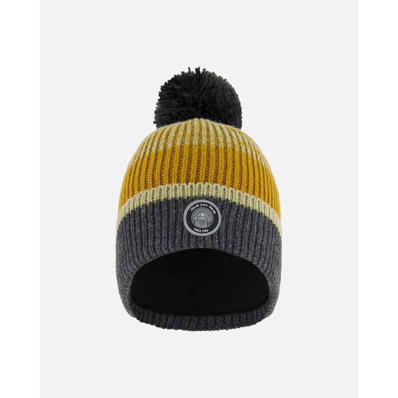 Fulfilled by our friends at Deux par DeuxWarm up in cold weather with our Knit Hat Gray, Spice and Sage. With a horizontal stripe pattern, this soft acrylic hat features a timeless look with a fluffy pompom on top and a signature logo patch on the front. A