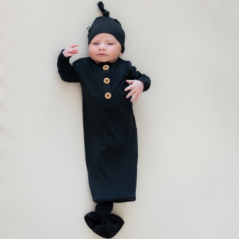 Elevating your newborns comfort has never been easier with buttery soft rayon made from bamboo, which is hypoallergenic and can even help with eczema symptoms. The classic dark midnight color of this knotted gown is a closet staple and helps hide newborn spills and stains. The look is finished off with an adorable, knotted hat, ensuring your little one is both cozy and stylish.