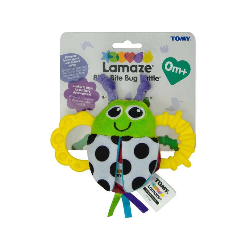 Lamaze Bity Bite Bug Rattle is easy for any baby to grasp onto making it the perfect addition to any baby's stroller. This rattle's features include peekaboo flap wings/textured teether handles, crinkle and jingle plush body and knottie antennas. The crink