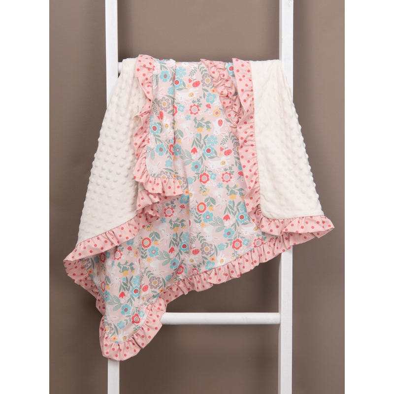 Watch all your little bunnies hop into spring with this elegant MNC exclusive collection!This high-quality collection has the softestmaterial!This sweet blanket features one soft minky side & ourLilly Belle Cottontailprint on the other with polka dot ruffle trim.