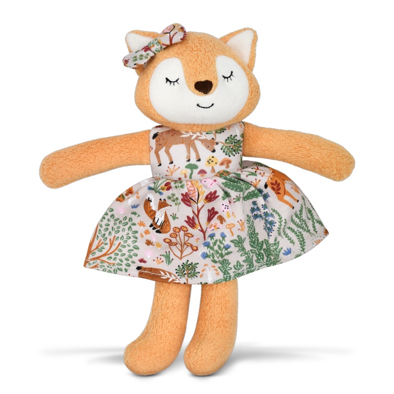 100% GOTS certified organic cotton Filled with organic cotton and naturally hypoallergenic corn fiber OEKO-TEX 100 eco-friendly fabric dyes Embroidered eyes, nose and mouth details Little dress and matching bow in bamboo organic cotton blend Size: 9 x 2.5