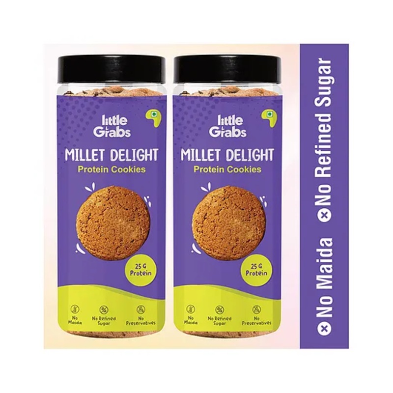 Little Grabs Millets and Seeds Cookies are madefrom healthy ingredients like Jowar, Bajra, Oats flax seeds, sesame seed etc25 g Protein and 16 g fiberNo Added White Sugar or EggNo Maida, No Palm oil, No PreservativesEach cookie contains 1.5 gram proteinMad