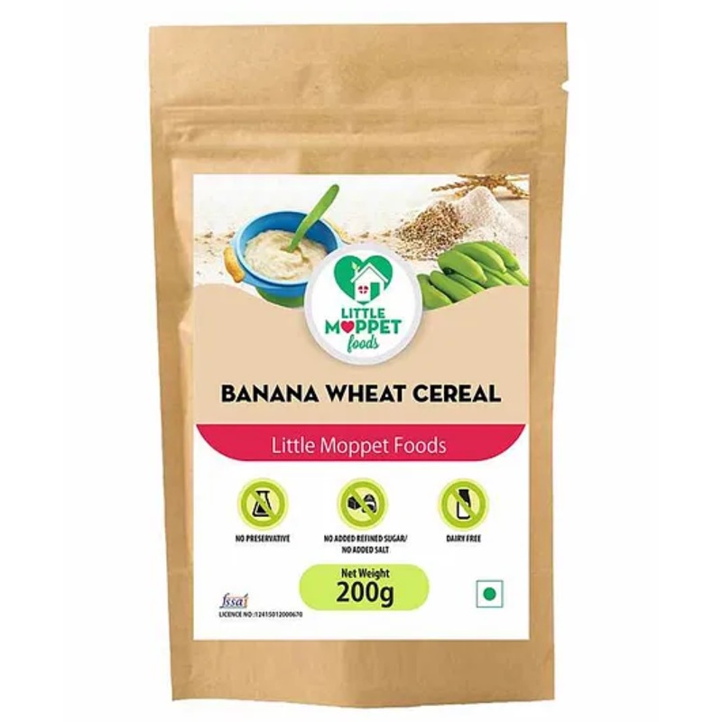 • Recommended Age – 6 to 12 MonthsItems included in the Package 200g ofBanana Wheat Cereal Note Mother’s milk is best for your baby. The first stage of weaning your baby is fairly simple, as most Moms offer a puree of a single fruit or vegetable or a single grain cereal. However, as your baby gets used to these, it’s time to mix things up and get her used to more complex flavors. Mixing grains and fruit or veggies also increases the nutritional value, as in Little Moppet Foods’ Banana Wheat Cereal! Little Moppet FoodsBanana Wheat Cereal is an excellent source of carbohydrates, since it includes raw Kerala bananas and wheat two fiber-rich starchy foods that are ideal for gaining weight. As your baby becomes more mobile and starts crawling, reaching and standing, he needs more energy for his daily activities. Besides, the high fiber ensures that he doesn’t strain during bowel movements and also succeeds in maintaining health cholesterol and blood sugar levels. What can be more convenient than a dish that is already pre-mixed in the perfect ratio, so that you don’t have to worry about how much of each ingredient to mix. Once you’ve ensured that your baby is not allergic to wheat, Little Moppet Foods’ Banana Wheat Cereal is the ideal next stage baby food. It is made from 100% natural ingredients and flavored with elaichi rather than artificial flavors, so that your baby’s food is free from anything synthetic.