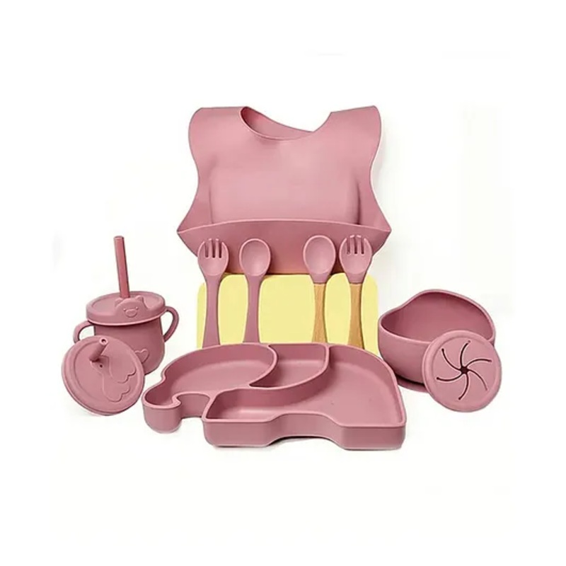 OCAL33215260958Luvlittle 11 Pcs Silicone Baby Feeding Set, Bpa Free & Microwave Safe Dinner Tableware Kit – Feeding Bowl, Suction Plate, Cup, Spoon, Fork & Bib for Kids Maroon (design and Colour May Vary)