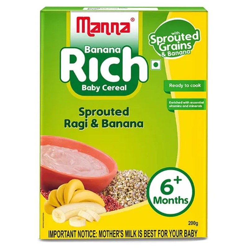Ready to cook foodCereal based foodFortified baby food with sprouted grainsFree from artificial colors, preservatives and flavorsSpecificationsBrand -MannaType -Banana Rich Cereal Based FoodAge - 6 to 24 MonthsWeight - 200 gmItems included in the Package20