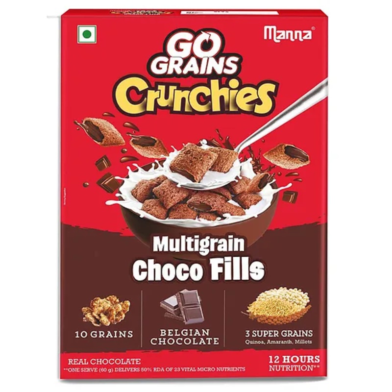 Multigrain Cereal Contains 3 Super Grains Real Belgian Chocolate Ensures 12 hour nutrition One serve gives 50% RDA.Specifications -Brand – MannaType – ?Cereal FlakesAge – 5+ YearsWeight – 450 gProduct DescriptionCRUNCH & CHOCOLATEY CREAM all in one bite – Experience the Crunch of 10 Grains ( Millets, Amaranth, Quinoa) and REAL BELGIAN CHOCOLATESAY NO TO MAIDA – Manna Multigrain Choco Fills has ZERO MAIDA. It has NO PRESERVATIVES and NO ARTIFICIAL COLORS12 HOUR NUTRION in EVERY BOWL Manna Choco fills is fortified with 23 Vitamins and Minerals which promote Growth & Immunity. Every bowl has 50% Required Dietary Allowance (RDA)Items Included -Multigrains 38.5% (Rice, Jowar, Wheat, Bajra, Ragi, Kodo Millet, Barnyard Millet, Quinoa, Amaranth), Sugar, Milk Solids, Dark Chocolate, Minerals, Cocoa Solids
