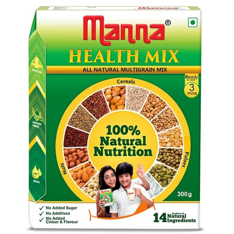 • Sago – Imparts good consistency to the porridgeSpecificationsBrand -MannaType -Health Mix PorridgeAge – 2 to 6 YearsWeight – 300 gmProduct DescriptionManna Health Mix – A source of Protien. Proteins are the building blocks of our body and are required to keep the immunity levels up. This breakfast porridge is full of whole grains like Ragi, Jowar, Bajra, Wheat and has pulses and nuts as well. This product is rich in dietary fibers which helps to keep your digestive system healthy. Iron is an important friend of blood, brain, muscle and immune system. This breakfast porridge is a natural source of iron and much more.Items included in the PackageHealth Mix Porridge (250 gm)