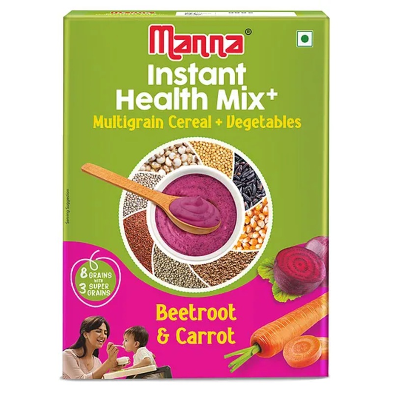 No flavouring agentsNo added preservatives26.4% RDA of Protein in one serve11% RDA of Calcium in one serve15% RDA of Iron in one serve17% RDA of Fibre in one serveSpecifications-BRAND- MANNATYPE- INSTANT CEREALAGE- 1- 3 YEARSQUANTITY-200GMEnriched with 3 super grains – Quinoa, Amaranth & Black RiceRich in Protein Proteins are building blocks of our body and help to boost immunityRich in Iron Iron helps in formation of red blood cells, boosts Stamina and helps in fight anemiaRich in Calcium Calcium helps in building strong bones and teethProduct Descrptions- The goodness of Manna Health Mix plus, now made easy and Instant enriched with three super grains (Quinoa, Amaranth & Black Rice) and with Vegetables – Beetroot & CarrotNutrition from natural sources is better absorbed than Fortified Food. Choose Manna Instant Health Mix which is 100% Natural Nutrition. Contains the Goodness of Real fruits and Real nutrition. Everything that a growing child needs.Items Included – Multigrain Flour 60% (Maize, Whole Wheat Atta, Jowar, Bajra, Ragi, Quinoa, Amaranth & Black Rice. Milk Solids, Vegetable Powders 20% (Beetroot powder & Carrot Powder)