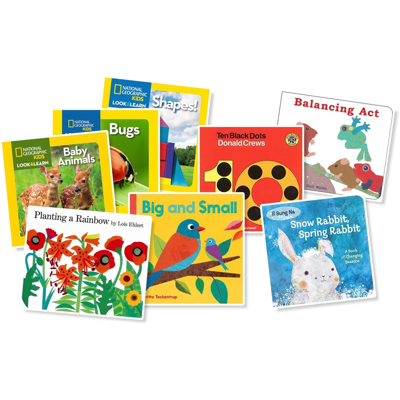 Titles Include:Big and SmallTen Black DotsBalancing ActPlanting a RainbowSnow Rabbit, Spring RabbitNational Geographic Look & Learn Series: ShapesNational Geographic Look & Learn Series: BugsNational Geographic Look & Learn Series: Baby Animals. Set of 8 B
