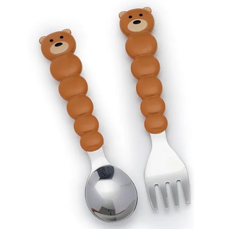 BPA-free, Lead-free, PVC-free, cadmium-freeColorful bulldog, cat, shark, and bear spoon andfork sets make feeding fun!Encourages independent self-feeding and developmentof fine motor skillsStainless steel fork,and deep stainless-steelspoons with thick roun