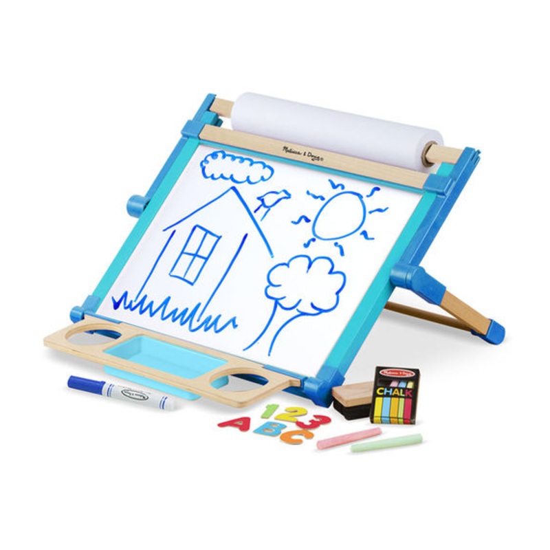 Inspire endless creativity with this double-sided tabletop easel, featuring a magnetic dry-erase board on one side, and a chalkboard on the other. The included paper-roll holder with a paper guide and tear-bar accommodates 12-inch paper rolls and adds even