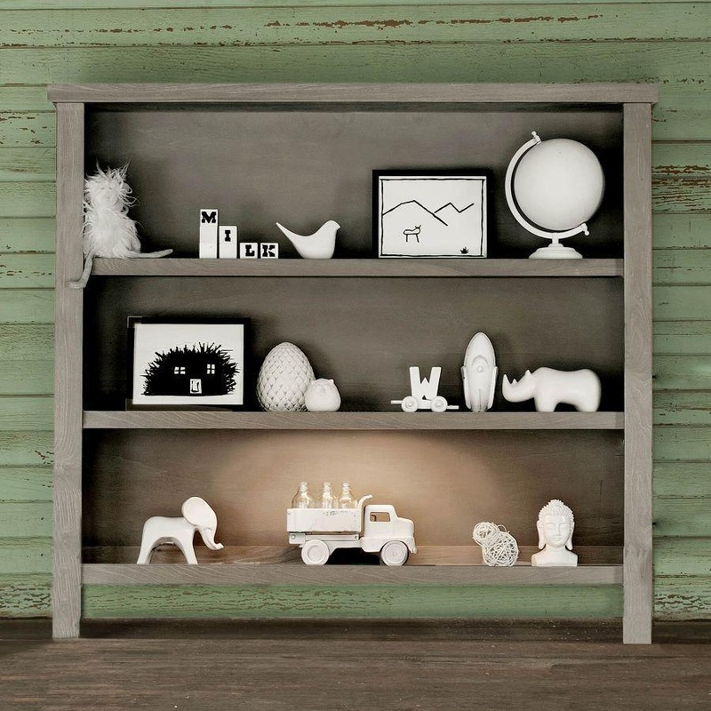 Milk Streets 2-shelf hutch is finished beautifully on top so you can choose to use it atop our double dresser or set it on the floor and use it as a bookcase. On the bottom shelf, four screw-on feet and mounting hardware are included with the hutch/bookcase along with an anti-tip hardware kit to be used for added safety whether it is functioning as a hutch or as a bookcase. The underside of the hutch is covered with a thick felt to protect the top of your 6-drawer dresser. The top shelf is stationary while the bottom shelf is adjustable and comes with self-locking clear clips. We added a light on the underside of the top shelf to enhance the display of decorative items on the shelves and can also be used as a nightlight for your baby or toddler. You will find a cut-out on the bottom edge of the hutch so you can slide wires through when choosing to put a TV or computer on the case top. This cut-out, while a simple feature, will keep electrical wires out of sight and reach of small hands. Make sure if you are using this piece as a bookcase on the floor, that you install the front two legs at the correct height shown in the assembly manual. It should set slightly higher, so that the bookcase leans back, keeping the weight of the bookcase against the wall. Just one more thing Milk Street does to keep everything as childproof as possible!