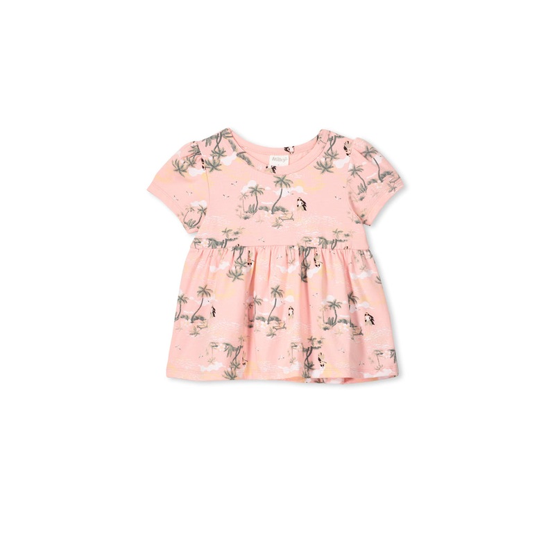 Milky Clothing Hula Girl Tee is such a cute lightweight smock styled tee and with the sweet little daisy print its hard to not love.Regular fit; smock style flared from waistCotton jersey construction with stretchCuffed short sleevesPink base; hula girl/Ha