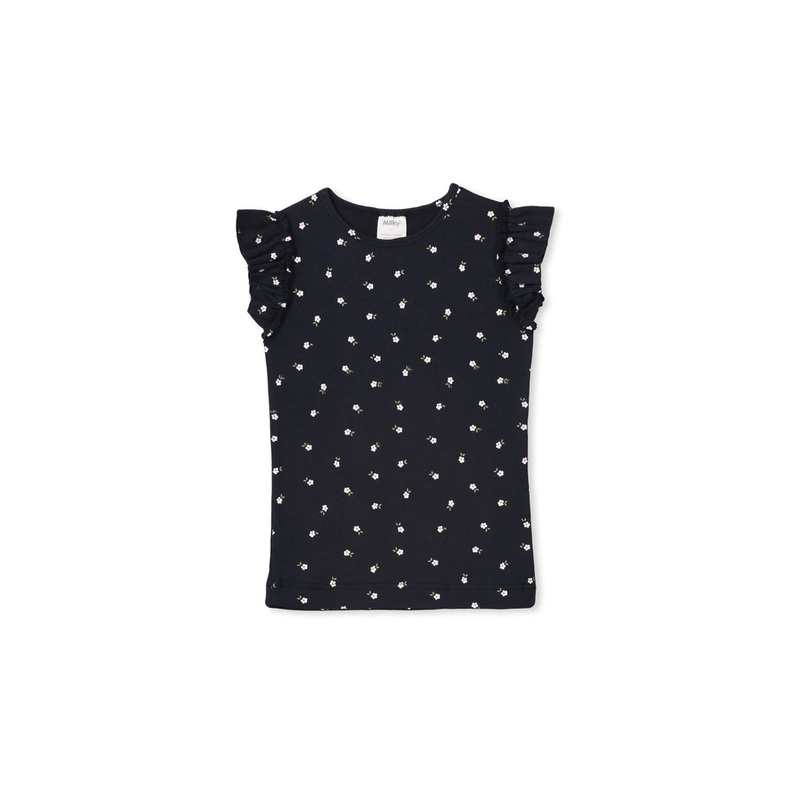 Milky Clothing Navy Floral Rib Tee has is made from a durable cotton rib fabric. This navy base tee has a delicate floral print and sweet frill detail on the shoulder.