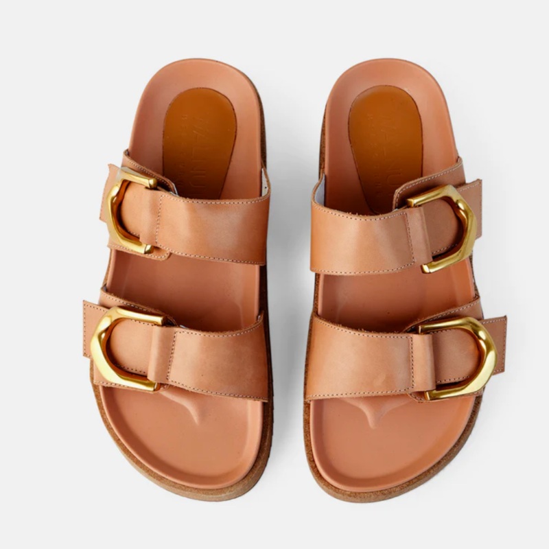 In a smooth tan leather upper, the Mint Slide is an easy-to-wear slide for summer days. With striking gold hardware, this style takes any simple look to the next level.Adjustable twin leather strapsStatement gold buckle detailSoft leather liningCushioned 1